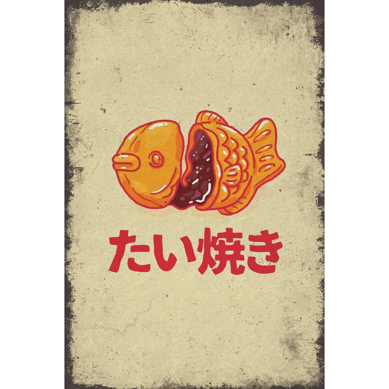 日本の伝統的なスイーツ「たい焼き」が描かれた、可愛い和風デザインのブリキ看板です。