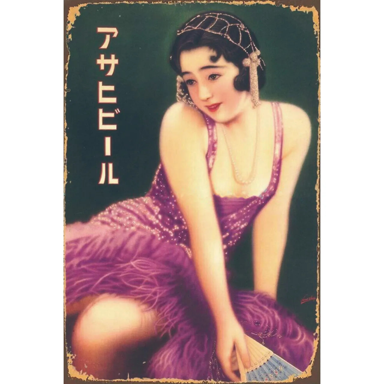 昭和初期の雰囲気を漂わせる、美人画とアサヒビールのロゴがデザインされたブリキ看板です。