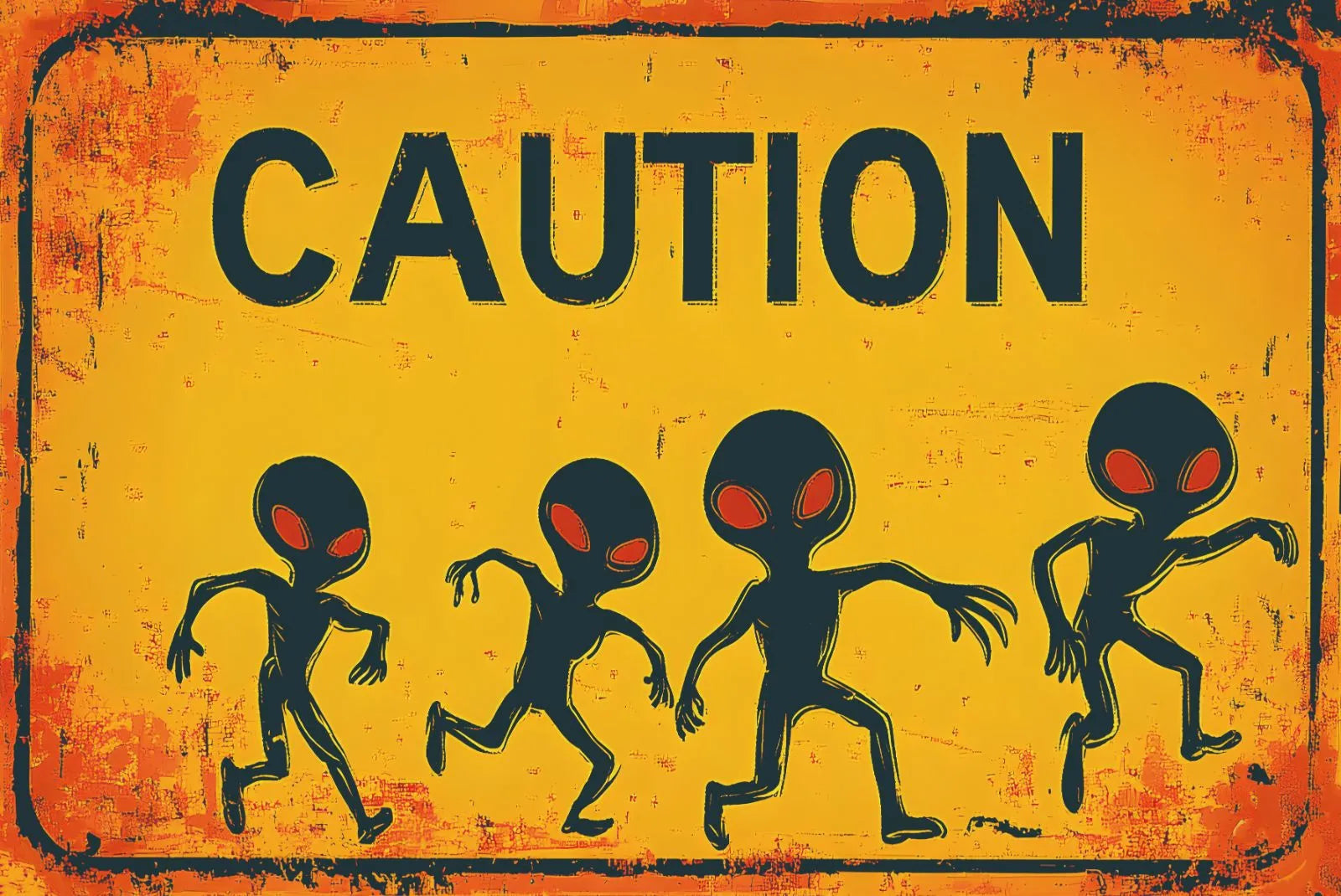 黄色と黒の警告風カラーに、赤い目の宇宙人イラストが描かれています。