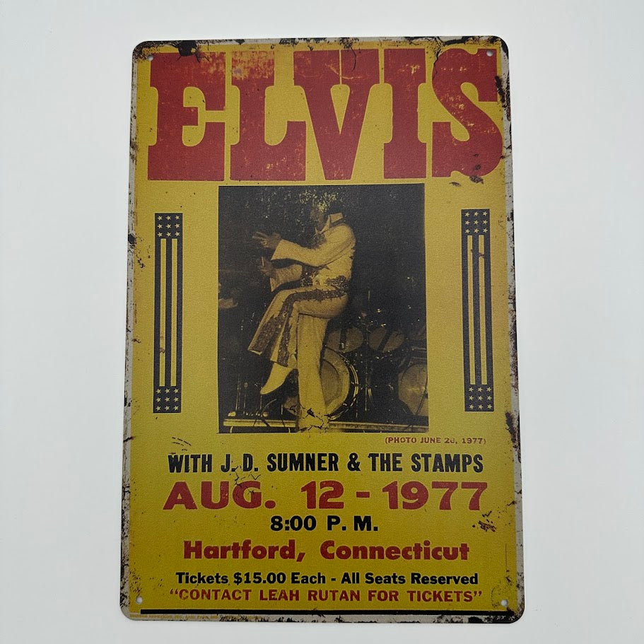 伝説の歌手エルヴィス・プレスリーの1977年8月12日ハートフォード公演を再現した、ヴィンテージ風デザインのブリキ看板です。 当時のチケット情報や出演者名、そしてステージ上のエルヴィスの姿がリアルにプリントされています。 レトロな雰囲気のイエロー&レッドの配色が目を引き、アメリカンヴィンテージの雰囲気をお部屋に演出します。 ブリキ素材ならではの重厚感と風合いがあり、経年加工風のデザインがファン心をくすぐります。 横20cm、縦30cmの壁掛けにぴったりのサイズ。 四隅には穴があり、簡単に飾れます。 音楽ファンやエルヴィスファンへのギフトにもおすすめです。