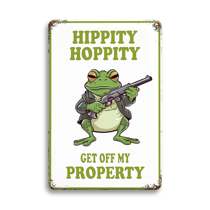 「HIPPITY HOPPITY GET OFF MY PROPERTY」というメッセージが印象的で、玄関やガレージのアクセントに最適です。