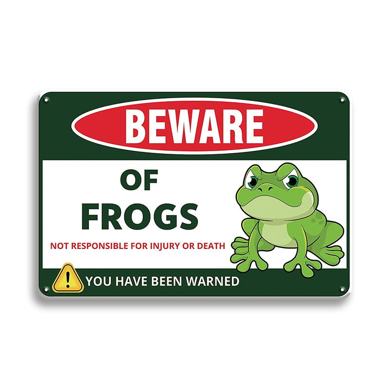ユーモア溢れる「BEWARE OF FROGS(カエル注意)」デザインのブリキ看板です。