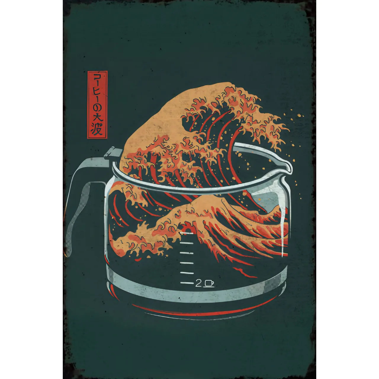 葛飾北斎の「神奈川沖浪裏」をモチーフに、コーヒーポットから大波が立ち上がるユーモアあふれるデザインのブリキ看板です。