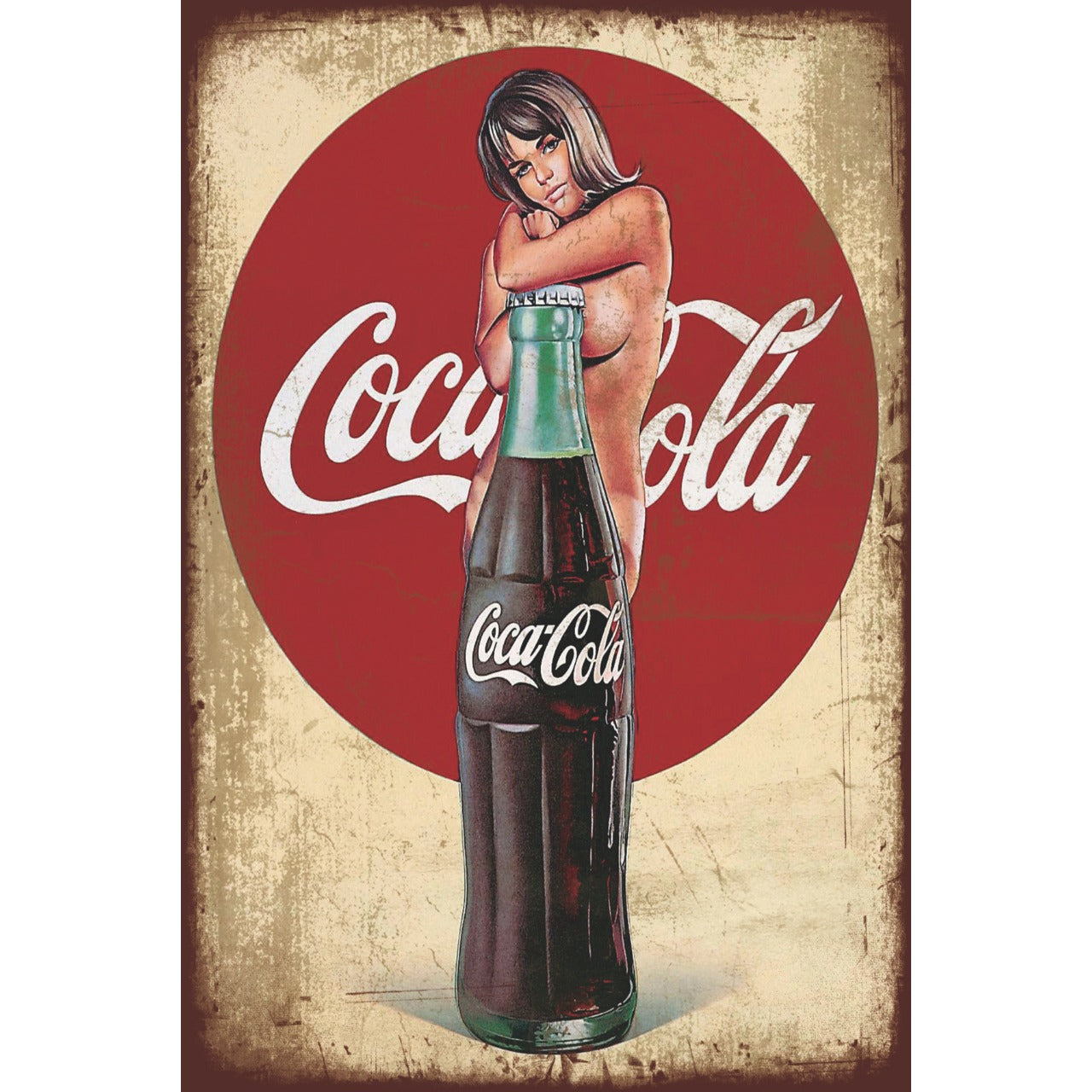 クラシックなコーラボトル風デザインと、レトロピンナップアートが組み合わせられたブリキ看板です。