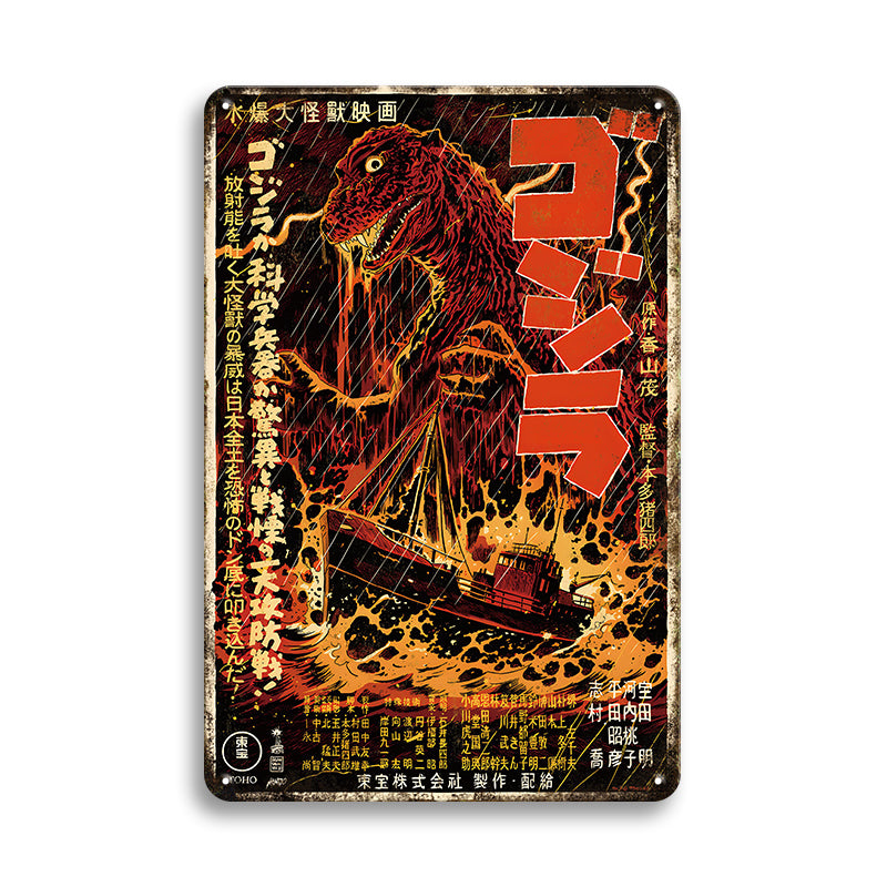 昭和の名作怪獣映画「ゴジラ」をデザインしたヴィンテージ調ブリキ看板。
