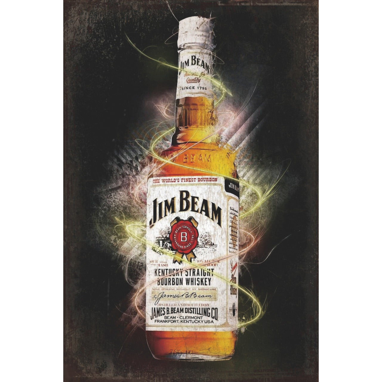 世界的人気を誇るバーボンウイスキー「JIM BEAM(ジムビーム)」のボトルデザインが描かれたブリキ看板です。 琥珀色に輝くボトルを背景の光が包み込み、ヴィンテージ感と重厚感が融合したスタイリッシュなデザイン。 バーやカフェ、ガレージのインテリアとして存在感抜群の一枚です。 厚みのあるブリキ素材を使用し、四辺(上下左右)はすべて裏側に折り曲げて加工されています。 壁掛け用の穴もあり、届いてすぐに飾ることができます。 サイズは縦30cm、横20cmです。
