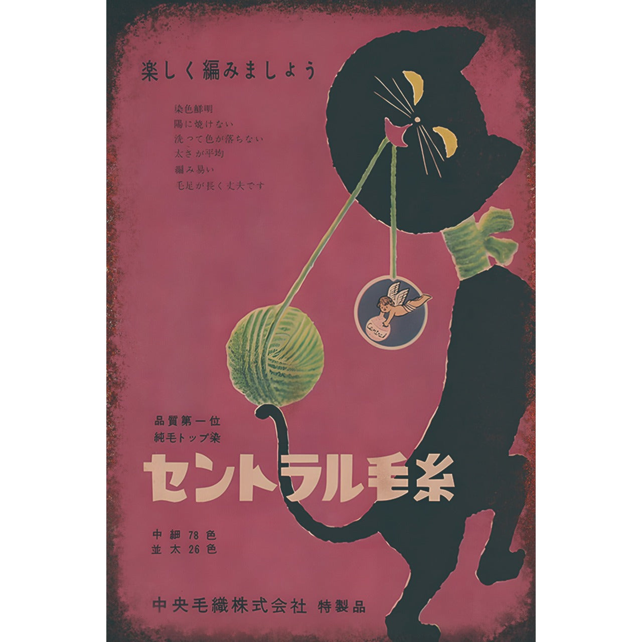 黒猫が毛糸玉で遊ぶ可愛らしいデザインが印象的で、ピンクの背景が温かみを感じさせます。