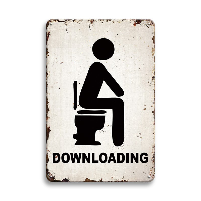「DOWNLOADING」の文字とトイレのイラストがユーモラスなブリキ看板です。