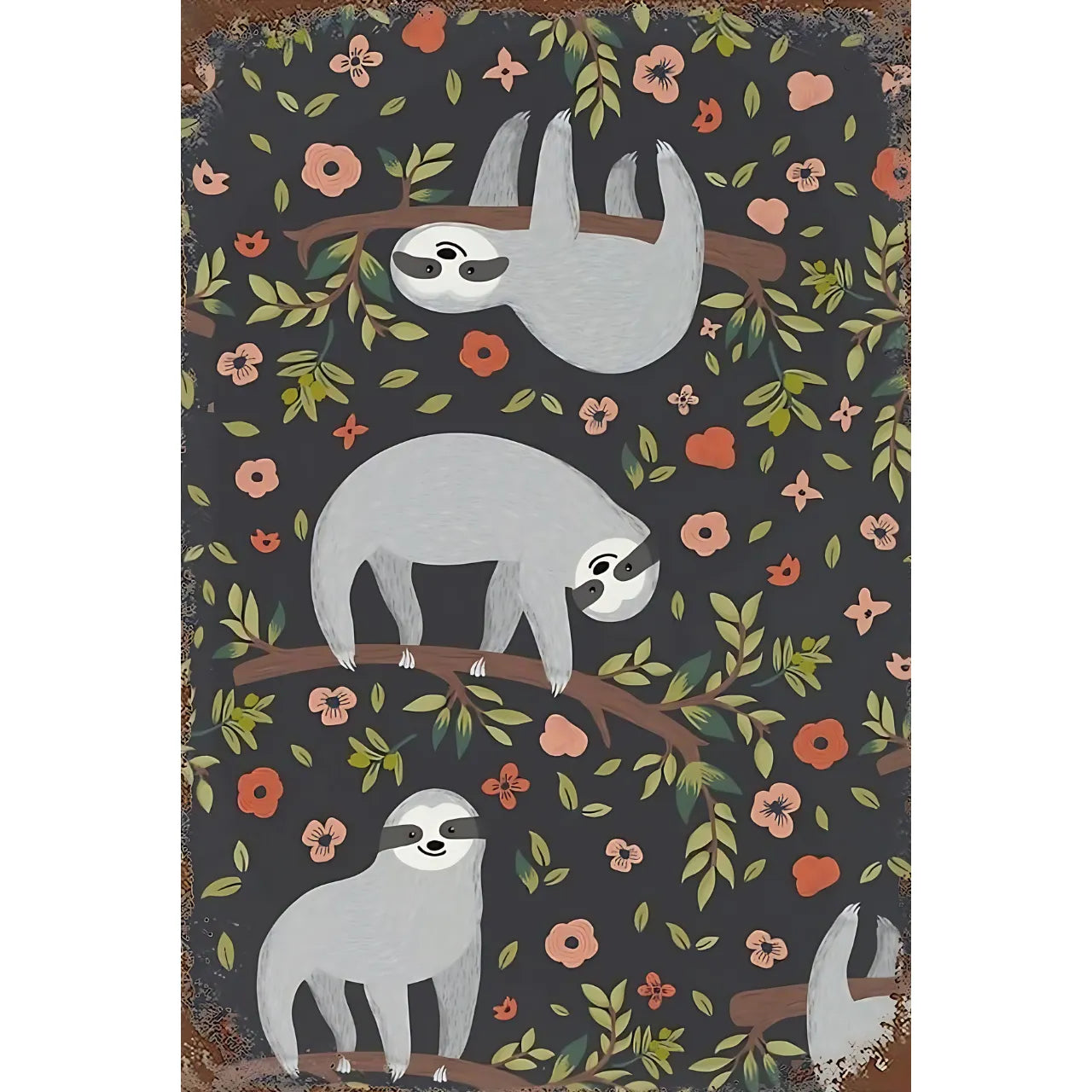 可愛いナマケモノが木にぶら下がった姿で描かれたブリキ看板です。