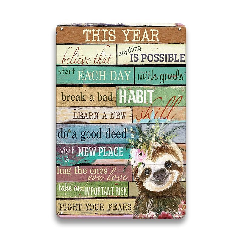 カラフルな英字メッセージと可愛いナマケモノが描かれたブリキ看板です。