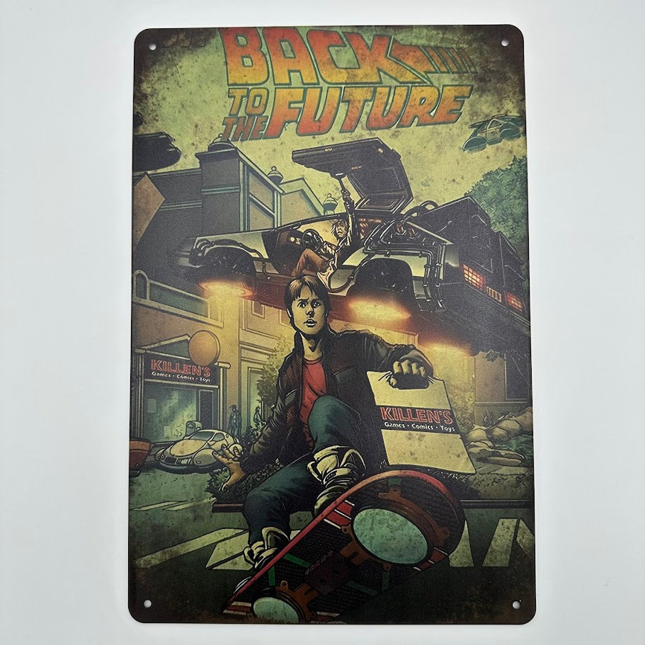 映画『BACK TO THE FUTURE(バック・トゥ・ザ・フューチャー)』をコミックアートで描いたブリキ看板です。