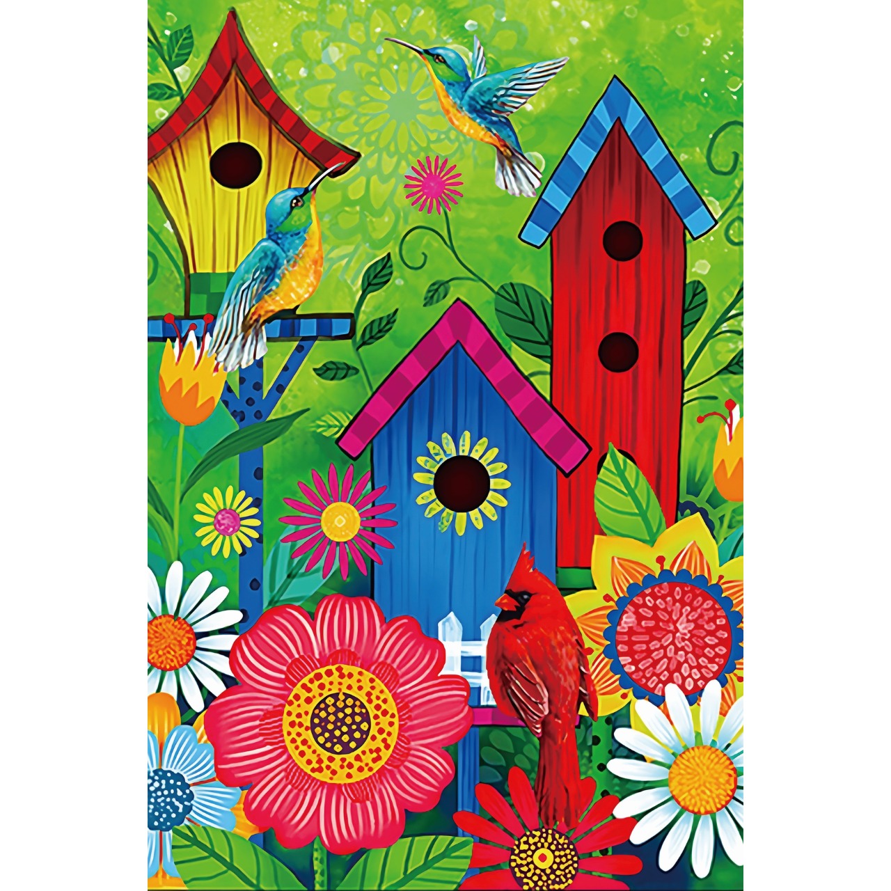 青や赤のバードハウス、咲き誇る花々、そしてハチドリやカーディナルが描かれた