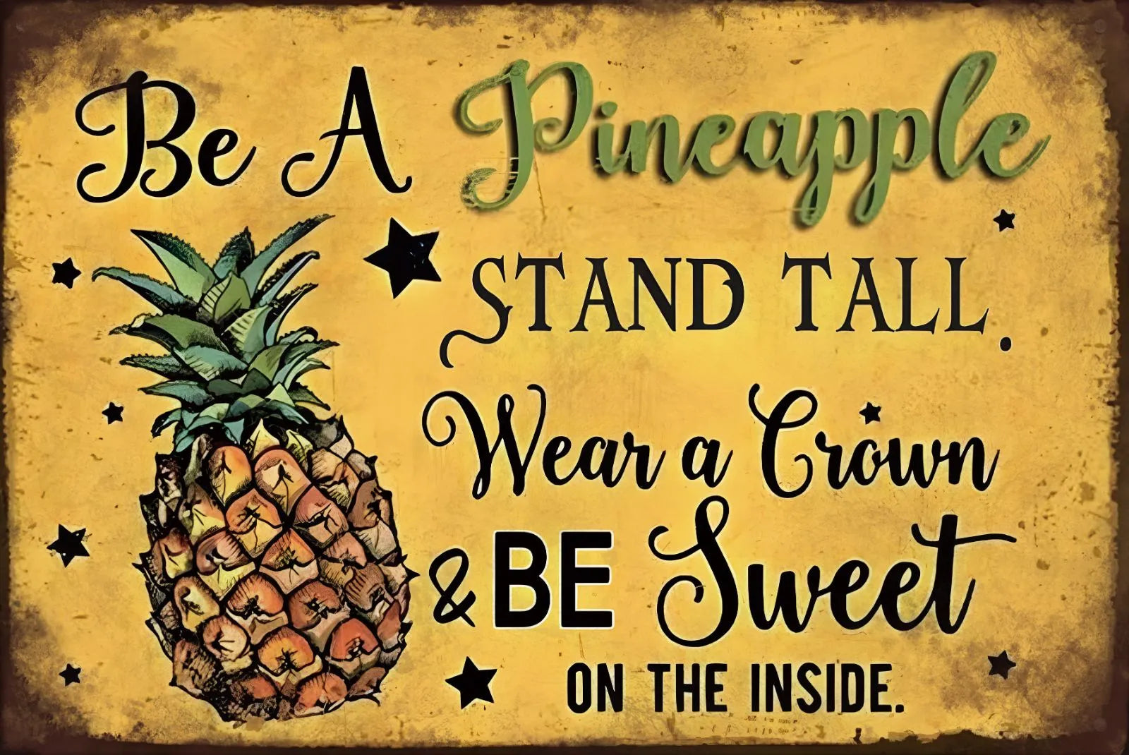 パイナップルと「Be a Pineapple. Stand tall. Wear a crown & be sweet on the inside.」のメッセージが描かれたブリキ看板です。