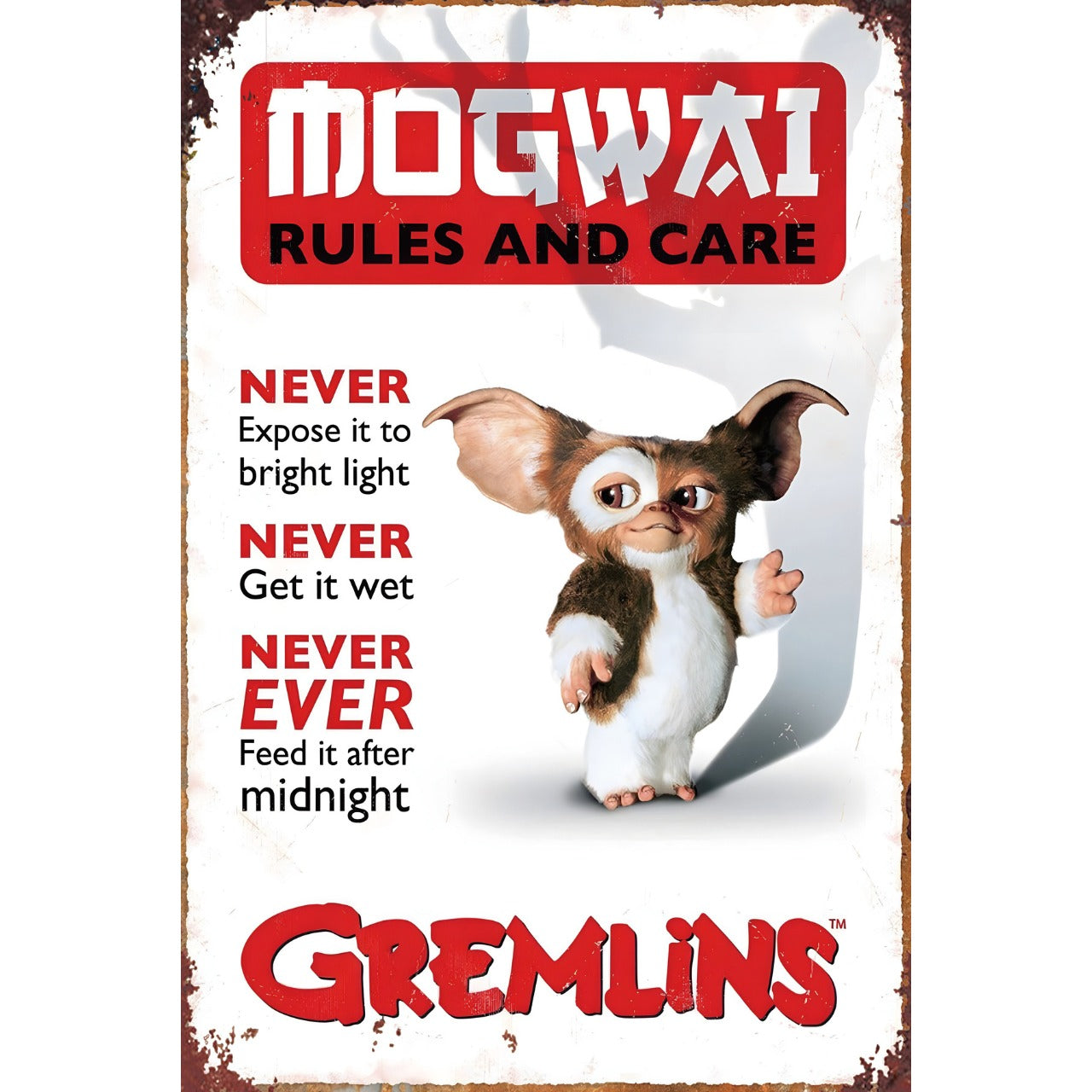 「GREMLINS MOGWAI RULES AND CARE」デザインのブリキ看板です。