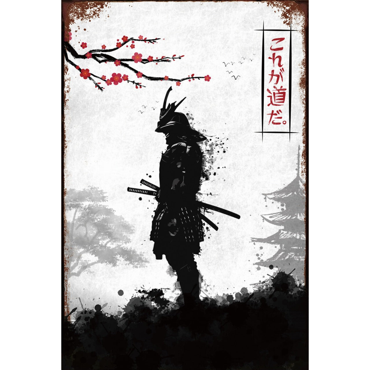 侍のシルエットが力強く描かれた和風アートデザインで、モノトーンに紅い梅の花が映える印象的な一枚です。