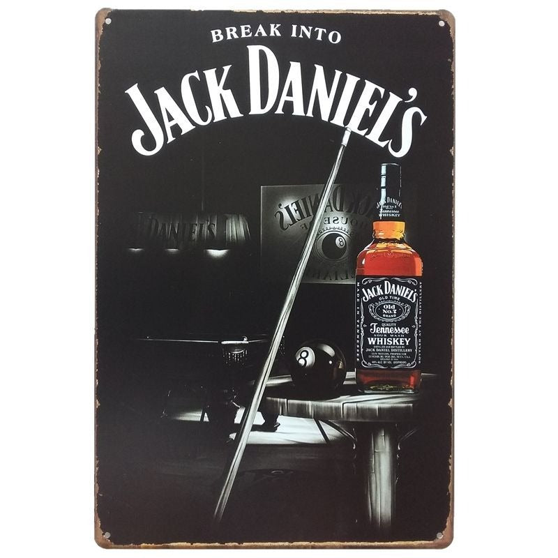ジャックダニエルのボトルとビリヤードモチーフが描かれたブリキ看板です。