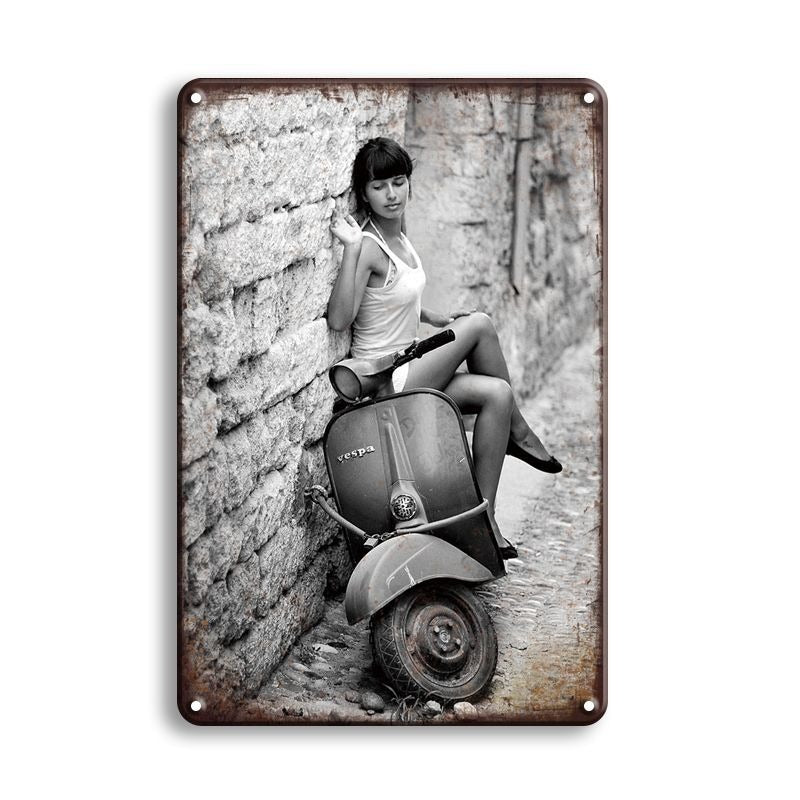 ベスパと女性モデルをモチーフにしたモノクロ調デザインのブリキ看板です。