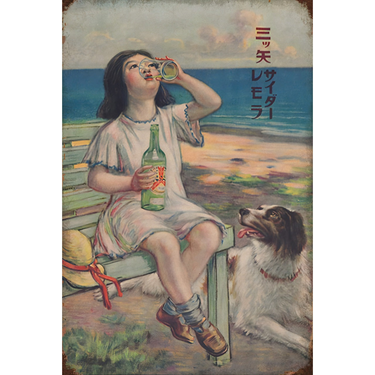 海辺のベンチで三ツ矢サイダーを飲む少女のノスタルジックなイラストが描かれています。