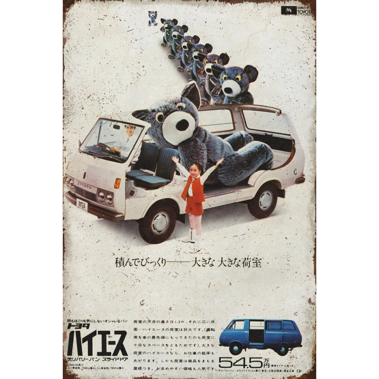 昭和レトロ感あふれるトヨタ・ハイエースの広告デザインが描かれた一枚で、