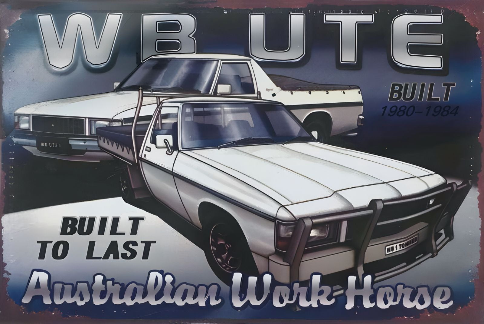 オーストラリアの名車「WB UTE(1980–1984)」が大胆に描かれたレトロ風デザインのブリキ看板です。