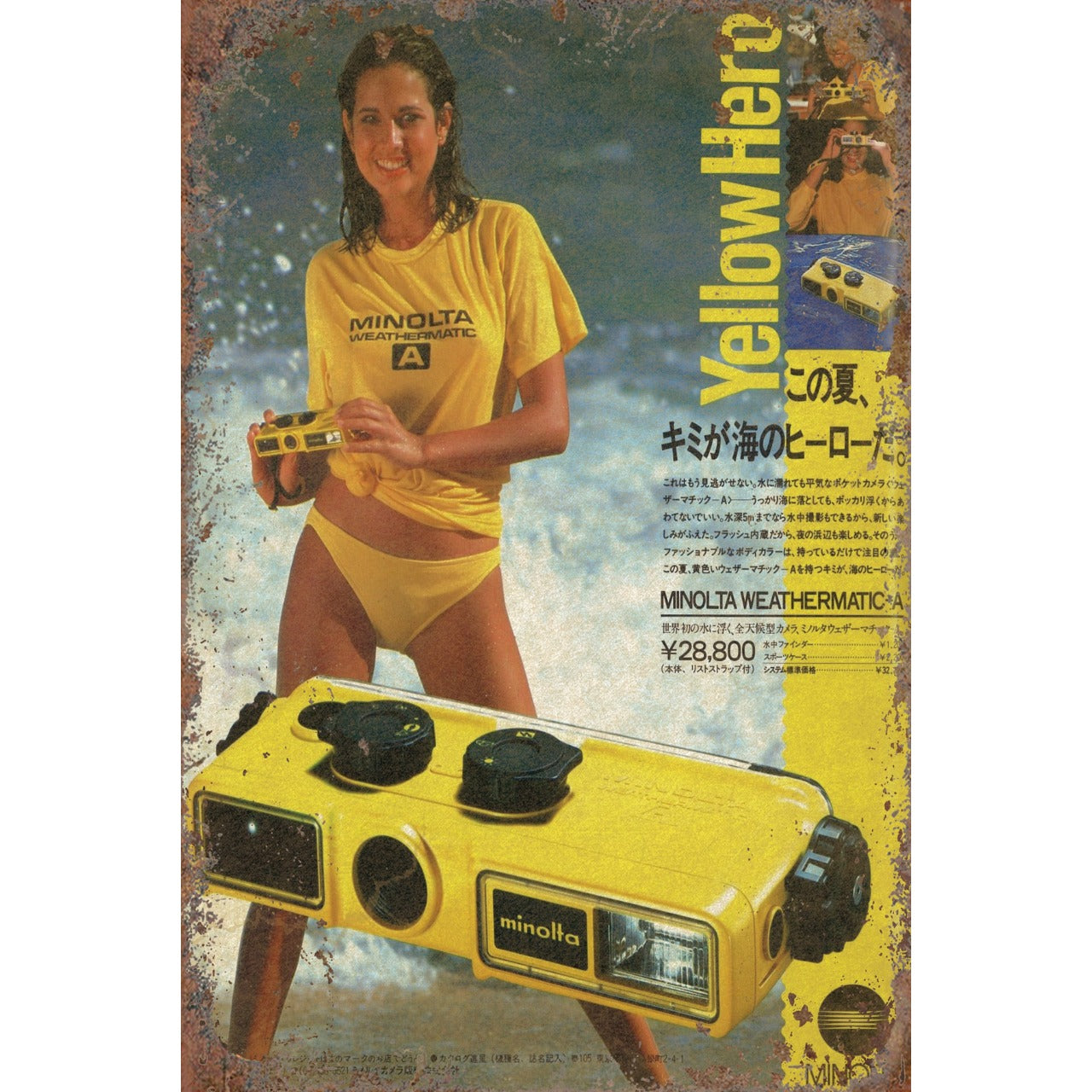 ミノルタ「WEATHERMATIC A」のレトロ広告が描かれた、