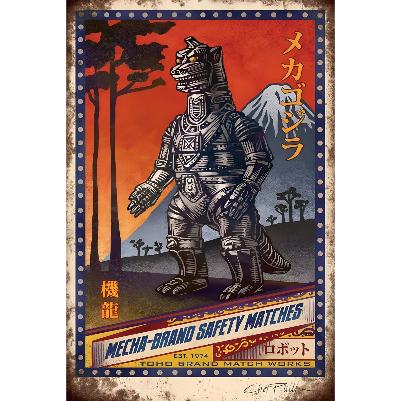 夕焼け空と富士山を背景に立つメカゴジラの姿が迫力満点で、マッチ箱風のアンティーク調レイアウトが独特の雰囲気を醸し出しています。