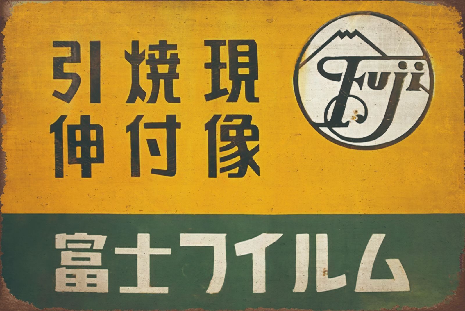 富士フイルムのレトロな広告デザインが描かれたブリキ看板です。