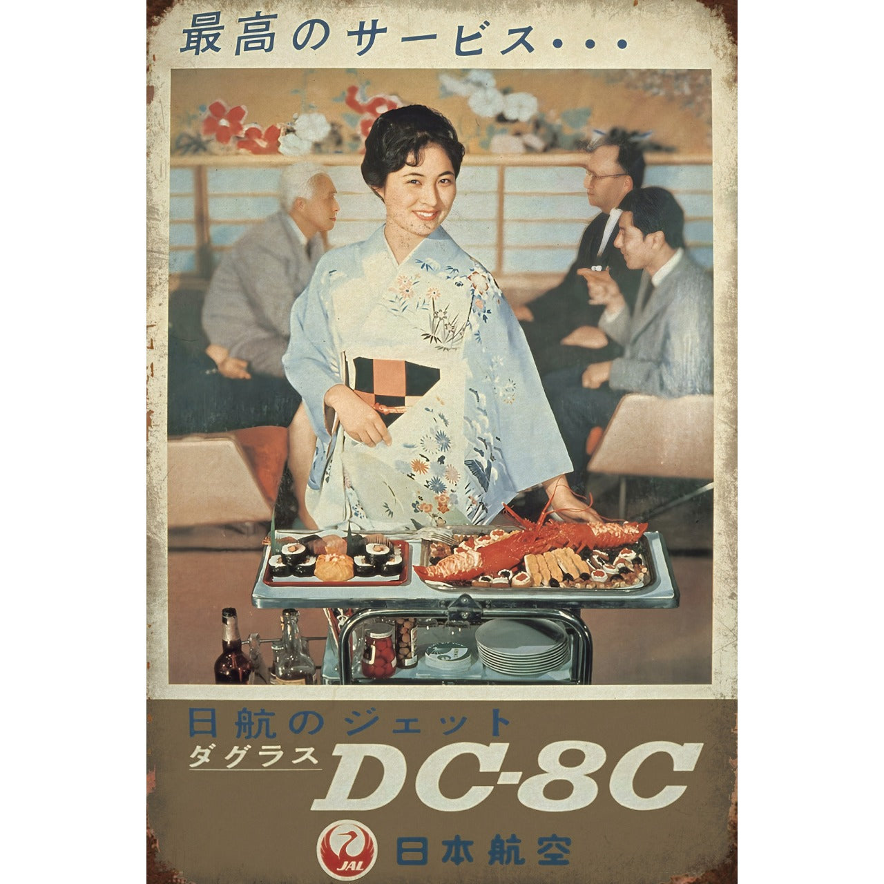 日本航空(JAL)のジェット旅客機「DC-8C」を題材にした昭和レトロな広告デザインが描かれています。