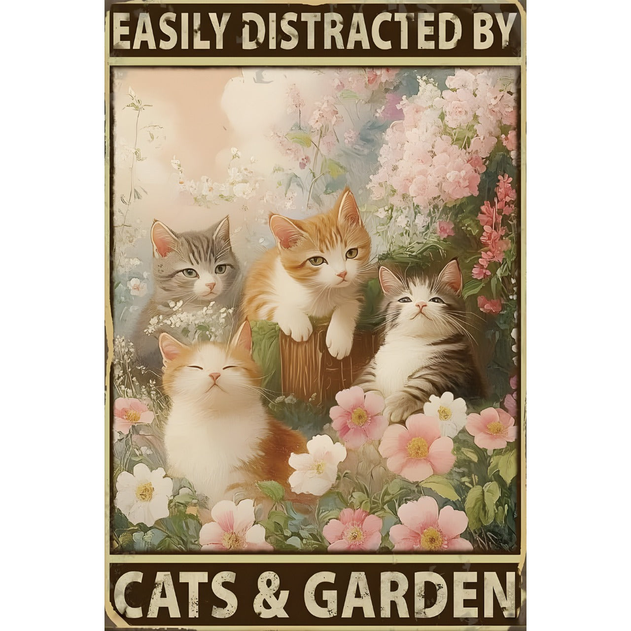 柔らかな花々に囲まれた、4匹の可愛い子猫が描かれた癒し系デザインのブリキ看板です。