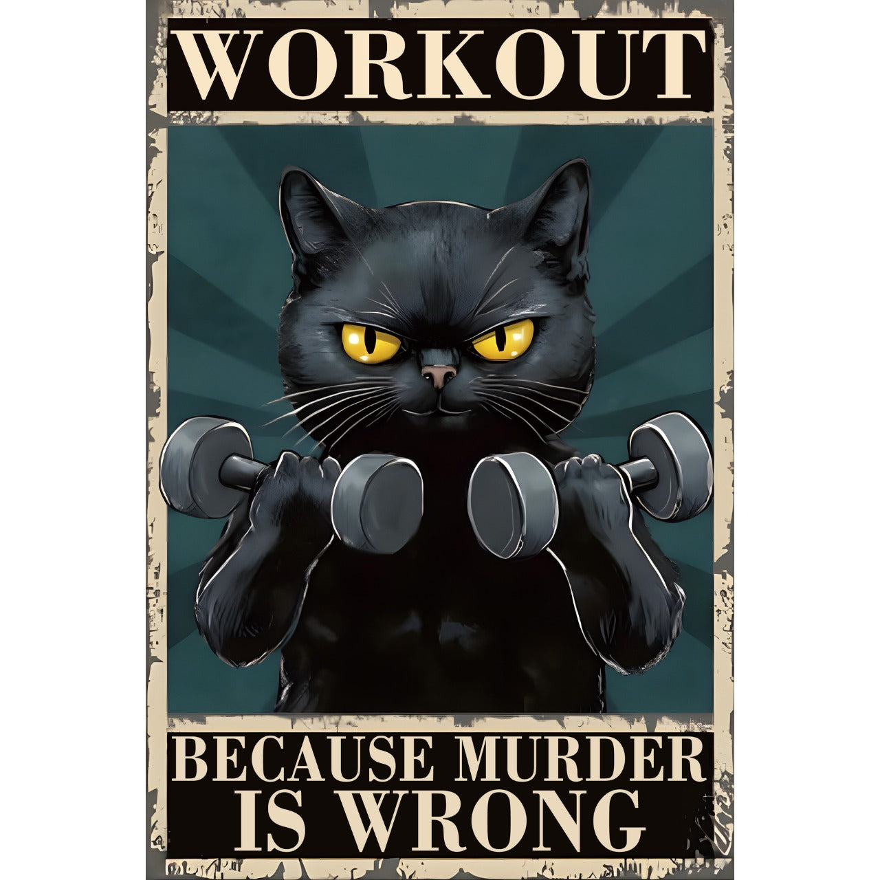 ダンベルを握りしめ、鋭い目つきでワークアウトに励む黒猫が描かれたユーモアたっぷりのブリキ看板です。