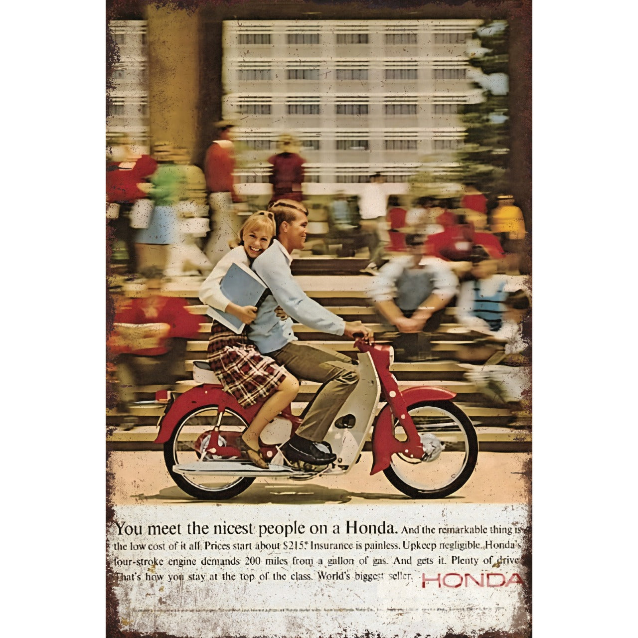 若い男女がホンダのバイクに乗る、アメリカンテイストのレトロ広告デザインが特徴の一枚です。