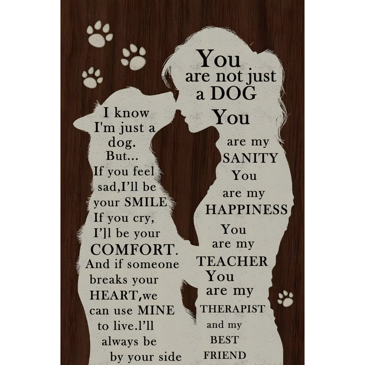 飼い主と犬が寄り添うシルエットに、 心温まるメッセージが描かれたブリキ看板です。 ウッド調の背景と犬の足跡デザインが、 優しく落ち着いた雰囲気を演出します。 「あなたはただの犬じゃない」 「あなたは私の幸せ、慰め、親友」など、 愛犬家にはたまらない美しい言葉が並び、 プレゼントとしても人気のデザインです。 本商品は縦向きで、サイズは 縦30cm・横20cm。 裏面は4つの辺(上下左右)がすべて裏側に折り曲げて加工されています。 軽量なので、お部屋・玄関・カフェスペース・ドッグルームなど さまざまな場所に飾りやすいアイテムです。