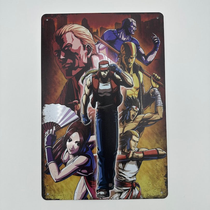 SNKの名作格闘ゲーム『餓狼伝説(Fatal Fury)』の人気キャラクターたちが集結したブリキ看板です。
