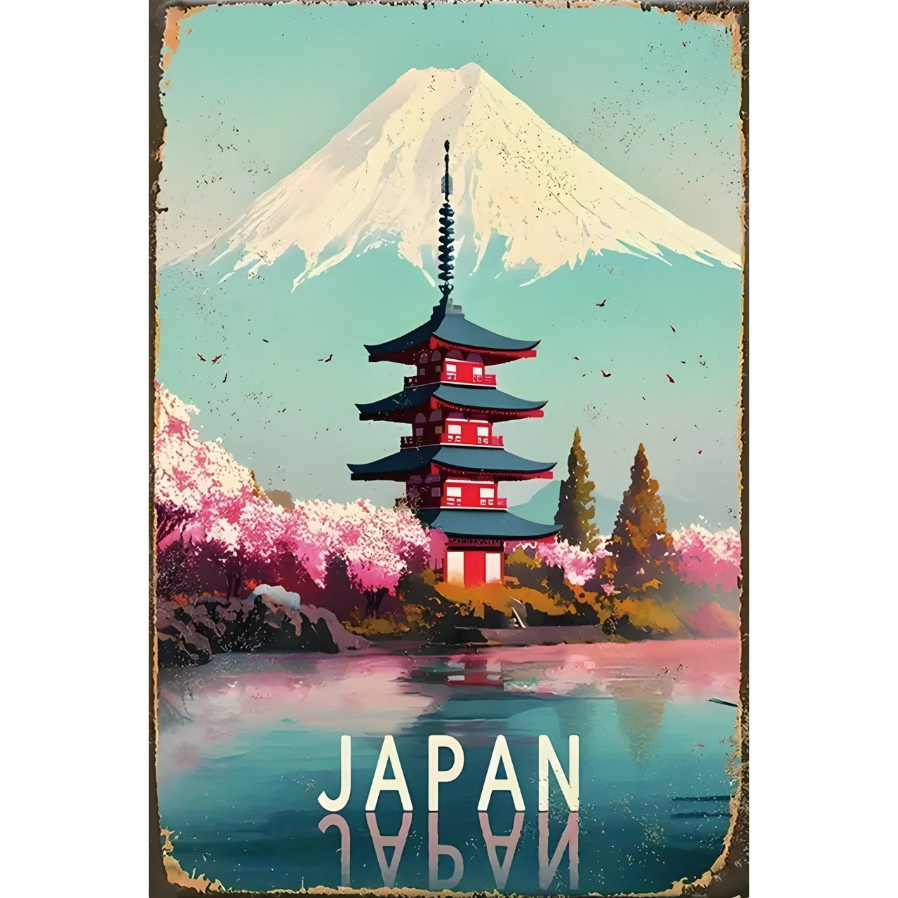 「JAPAN」富士山と五重塔を描いたトラベルポスターデザインのブリキ看板です。