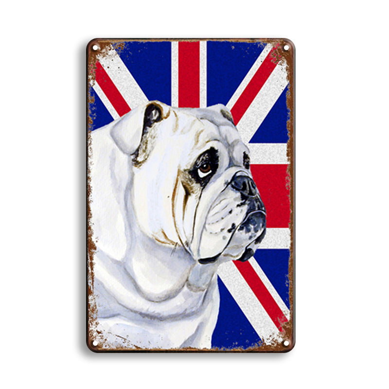 ユニオンジャックを背景にしたブルドッグデザインのブリキ看板です。