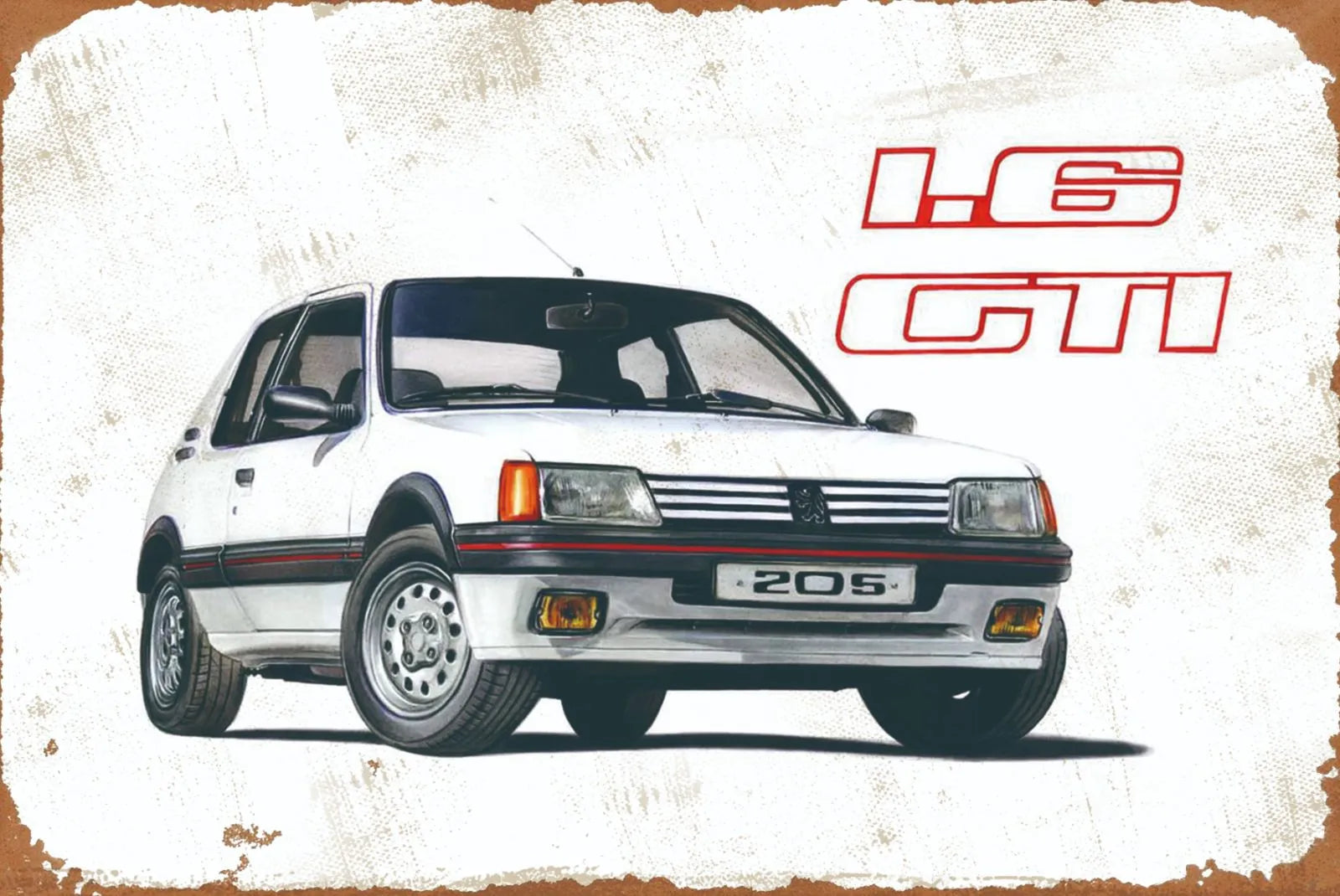 プジョー 205 GTI を描いたビンテージ風デザインのブリキ看板です。