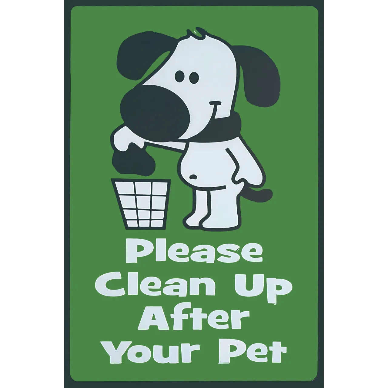 かわいい犬のイラストと「Please Clean Up After Your Pet」の文字が描かれており、公園や庭、ペットエリアにおすすめです。