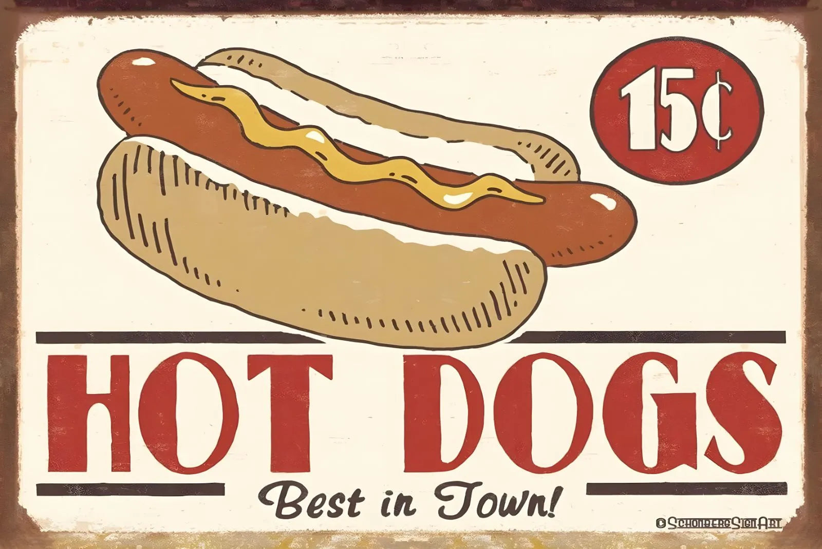 クラシックなホットドッグデザインが魅力のアメリカンブリキ看板です。 「15セント」の表示と共に、どこか懐かしいレトロな雰囲気を演出。 キッチンやカフェ、レストラン、ガレージのインテリア装飾に最適です。 古き良きアメリカンダイナーを思わせるデザインで、食べ物系雑貨としても人気の一枚。 看の裏面は上下左右すべての辺が裏側に折り曲げて加工されています。 サイズは横30cm、縦20cmです。