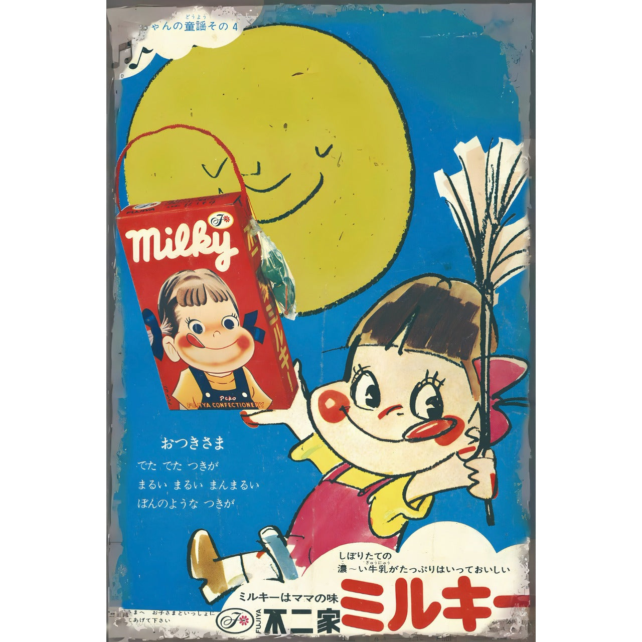 「ミルキーはママの味」という名コピーとともに、優しい色合いと筆描きタッチが心を癒します。