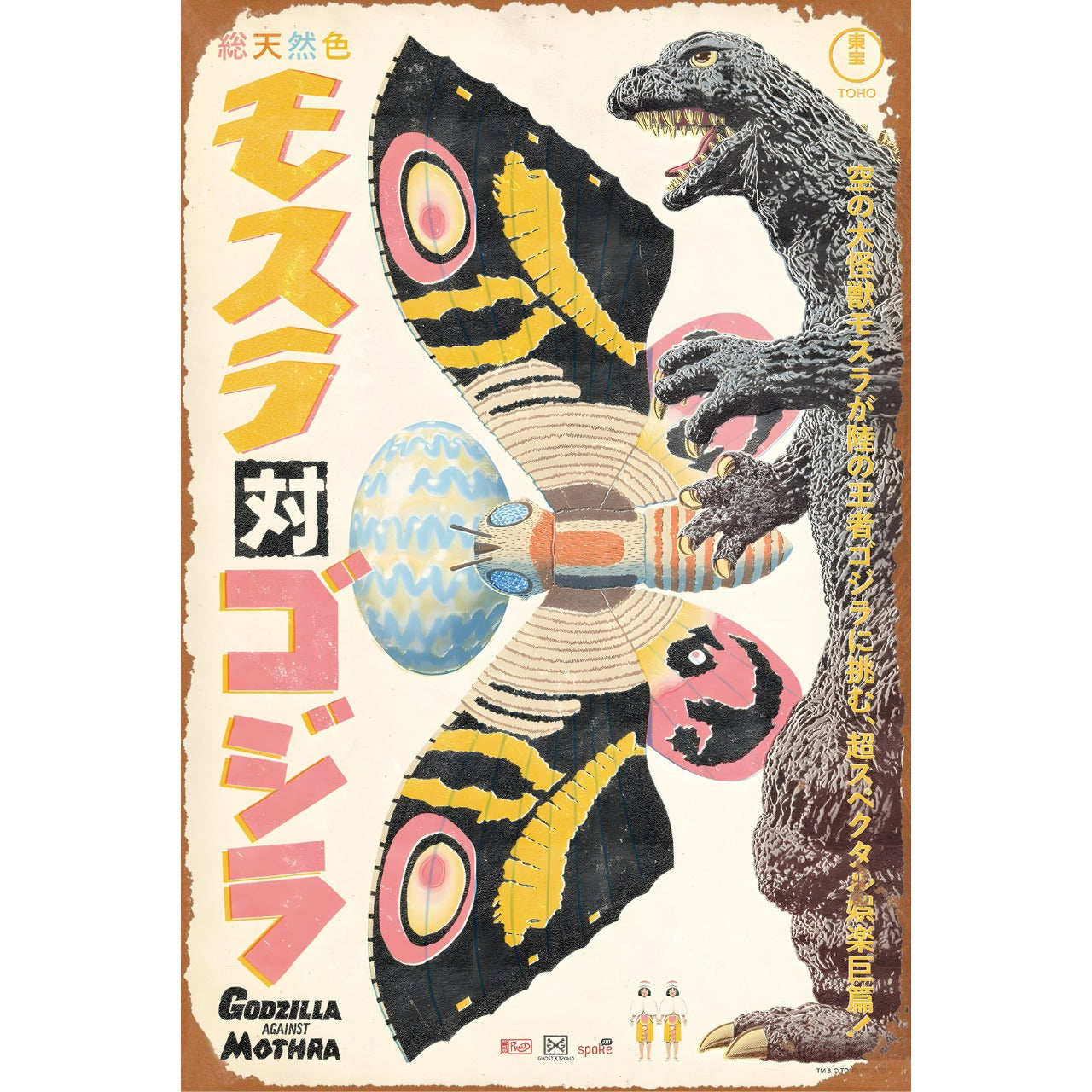 日本が誇る特撮映画の金字塔『モスラ対ゴジラ(MOTHRA vs GODZILLA)』をデザインしたブリキ看板です。