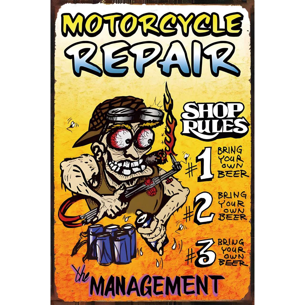 バイク好きにぴったりの「MOTORCYCLE REPAIR」ブリキ看板です。 ポップでユニークなデザインが目を引きます。 ガレージやバイクショップの雰囲気作りにも最適です。 看板の裏面は上下左右すべての辺が裏側に折り曲げ加工されています。 縦30cm、横20cmのサイズで存在感抜群です。