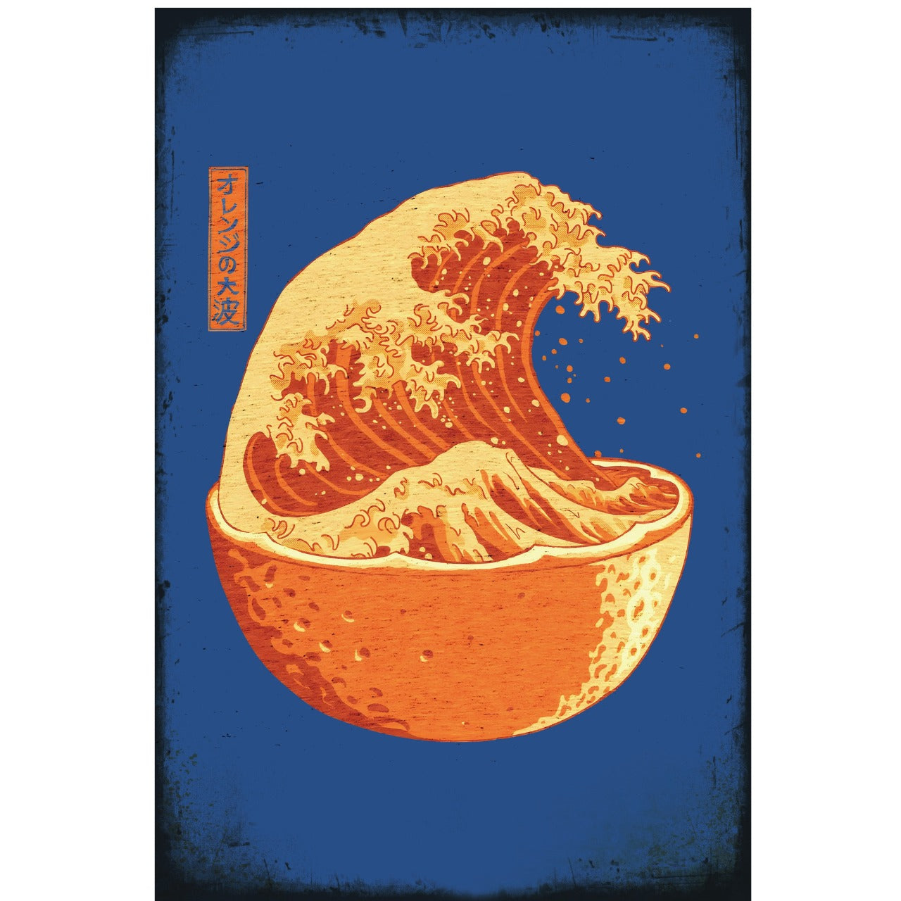 浮世絵風のダイナミックな波を、半分に切ったオレンジの中に描いた、