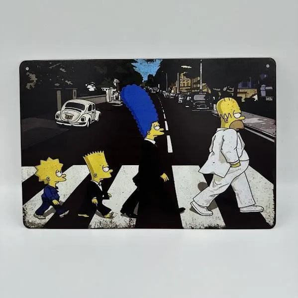 ザ・シンプソンズがアビーロードを渡るシーンが描かれた、ユニークなレトロ風ブリキ看板です。