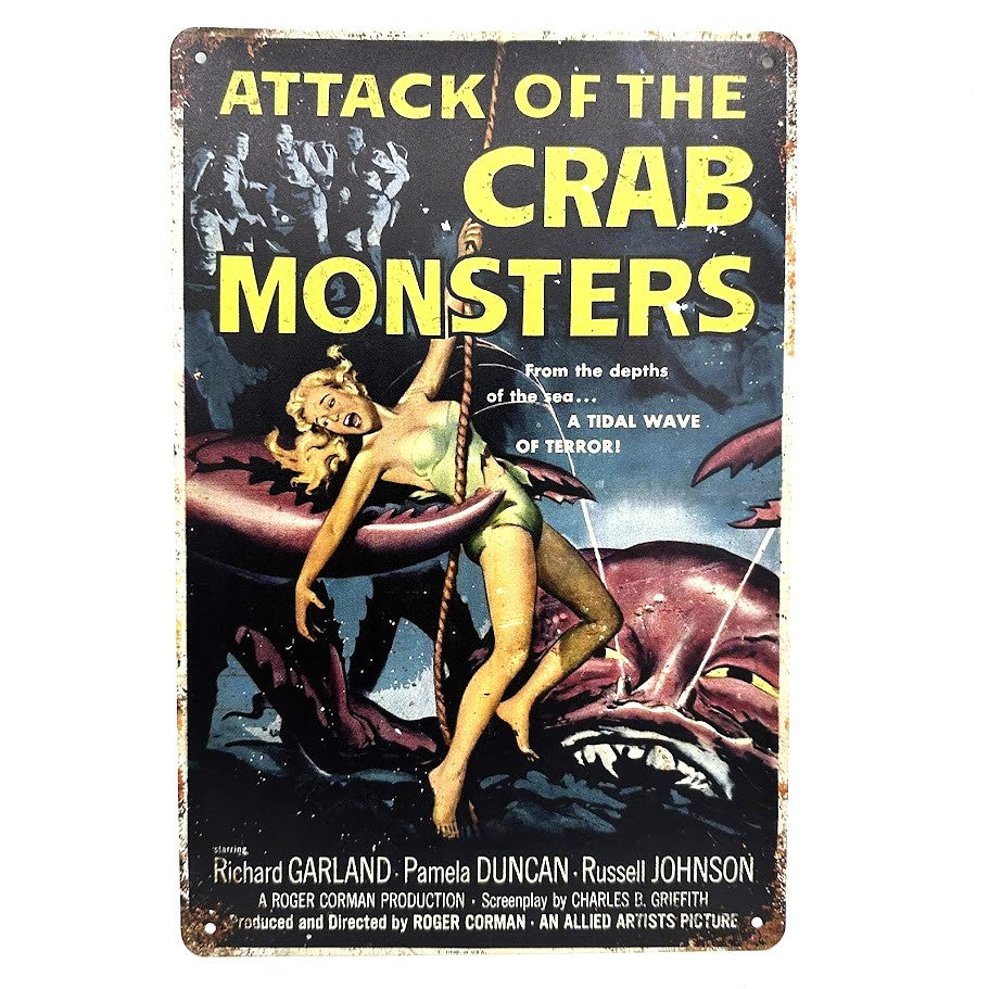1950年代のSFホラー映画「Attack of the Crab Monsters」をテーマにしたレトロなブリキ看板です。巨大な蟹モンスターに襲われるシーンが描かれたポスターで、ヴィンテージ感あふれるデザインが特徴です。映画ファンやホラー好きの方におすすめのインテリアアイテムです。
