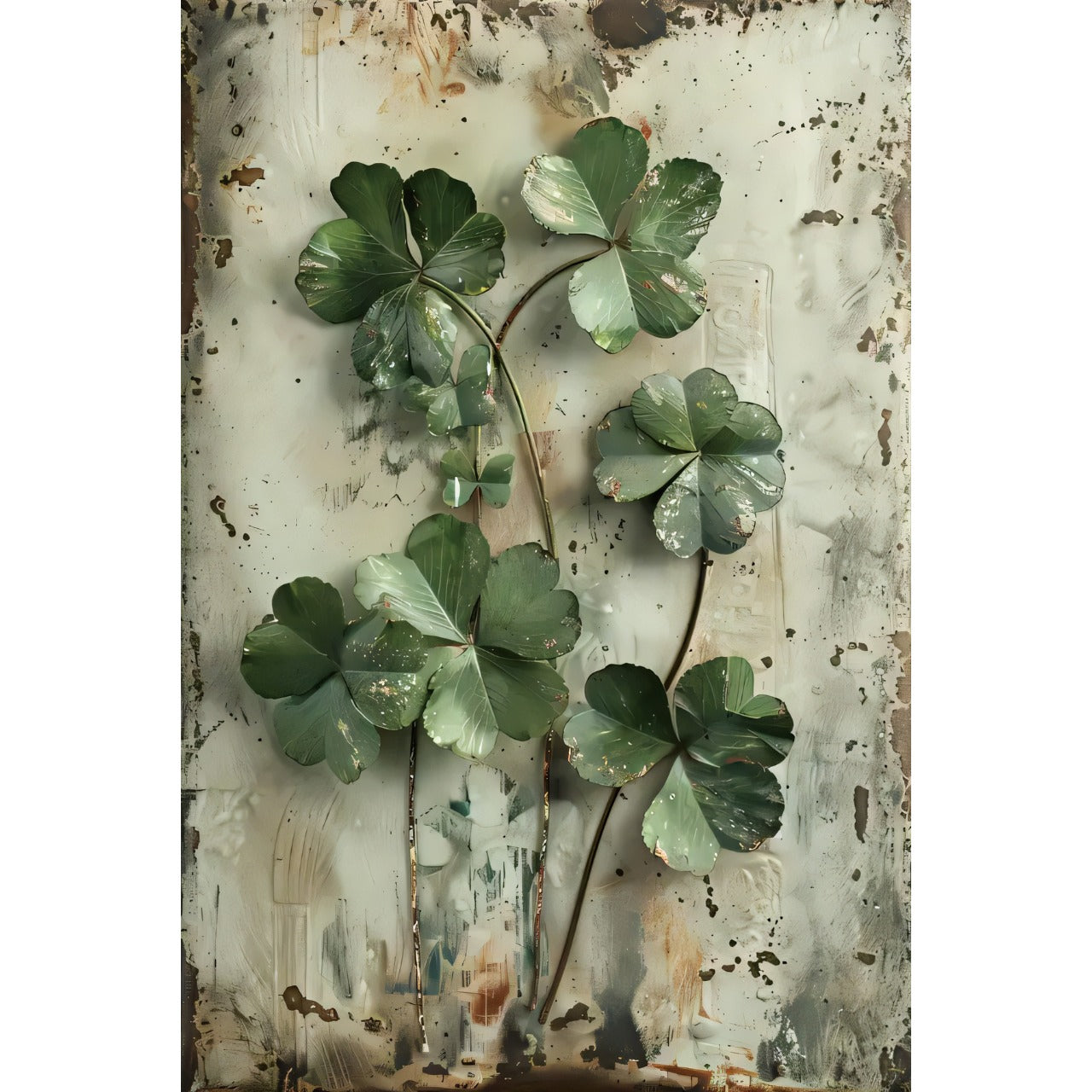 落ち着いたグリーンの葉と、錆び加工が施された背景が絶妙に調和し、