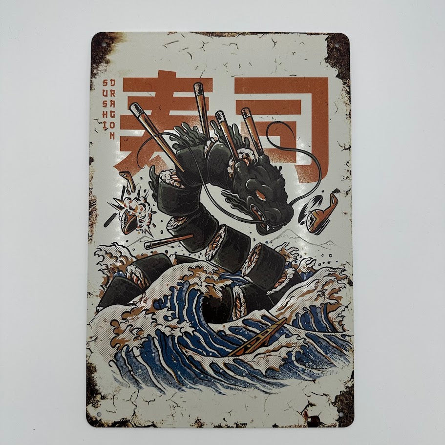 こちらは、寿司とドラゴンを融合させたユニークな浮世絵スタイルのブリキ看板です。