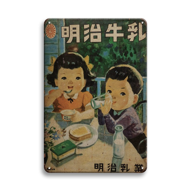 子供たちが牛乳や朝食を楽しむレトロなイラストが描かれており、当時の温かみある広告スタイルを再現しています。