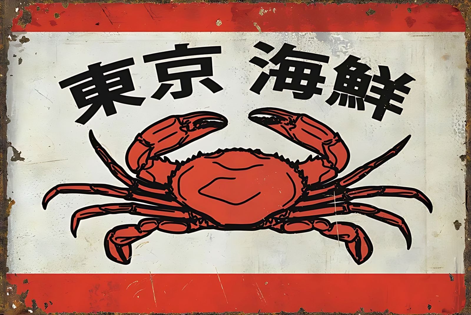 赤いカニのイラストが印象的な「東京海鮮」デザインのブリキ看板です。