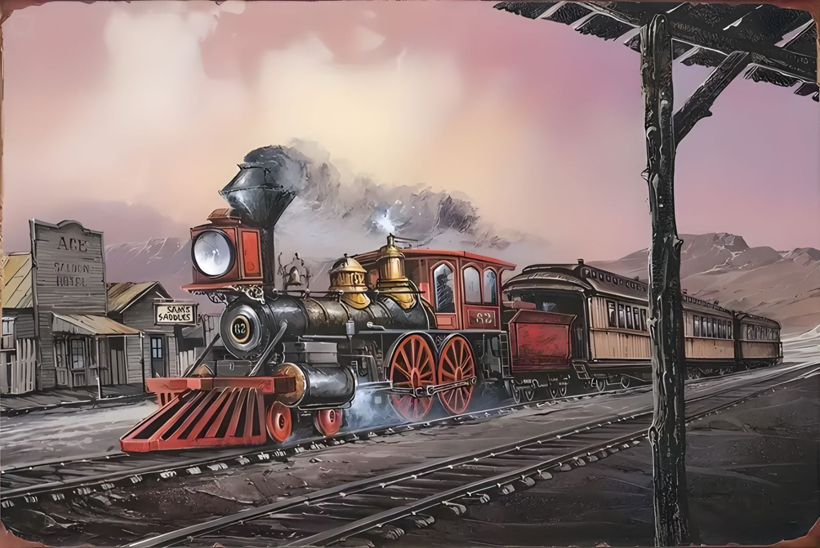 西部開拓時代のアメリカを思わせる、蒸気機関車が描かれたブリキ看板です。