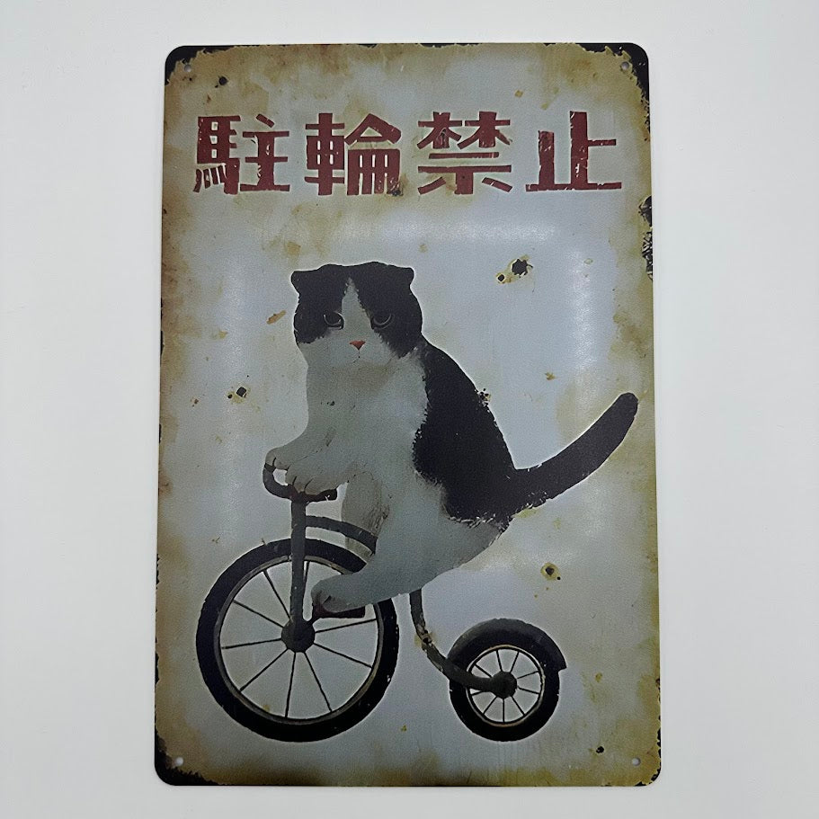 こちらは、「駐輪禁止」の文字とユーモラスな自転車に乗るネコが描かれたレトロなブリキ看板です。